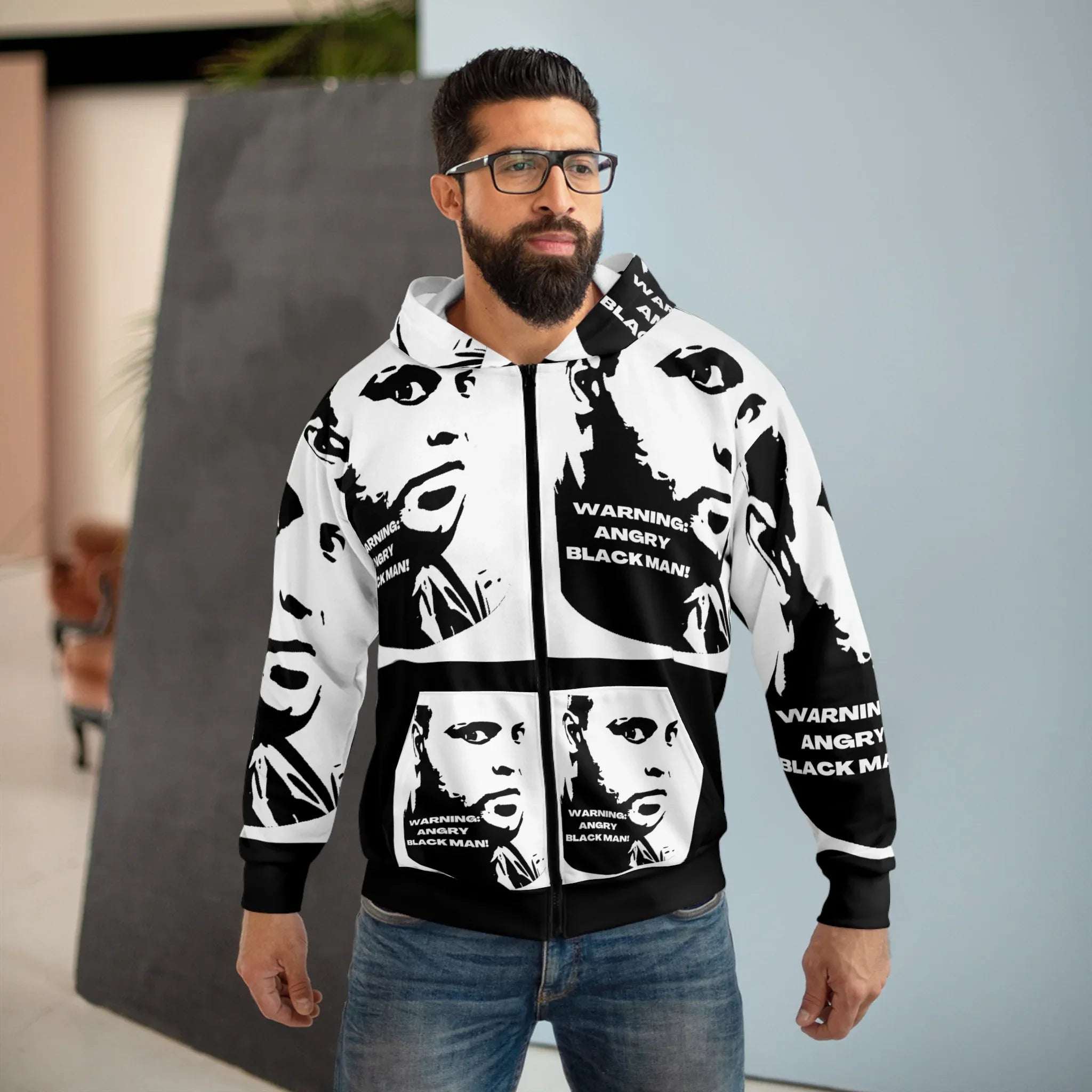 This Zipped fleece jacket will keep you nice and toasty through the cold. It’s a great all-over print zip hoodie that is easy to customize without fear of visible white lines at the seams. It has a large front pocket, black zipper, a roomy hood and is custom cut and sewn. It’s your perfect pick this winter.
